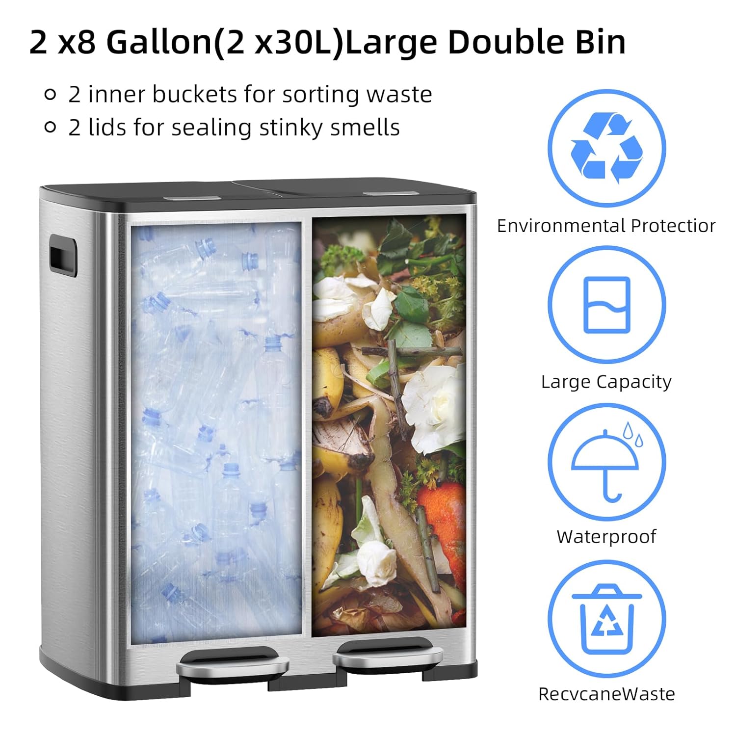 KUK 60 Liter / 16 Gallon Dual Trash Can with Lid, Stainless Steel Kitchen Step Garbage Can, 2 x 8 Gal Double Compartment Classified Rubbish Bin with 2 Plastic Inner Buckets Silver