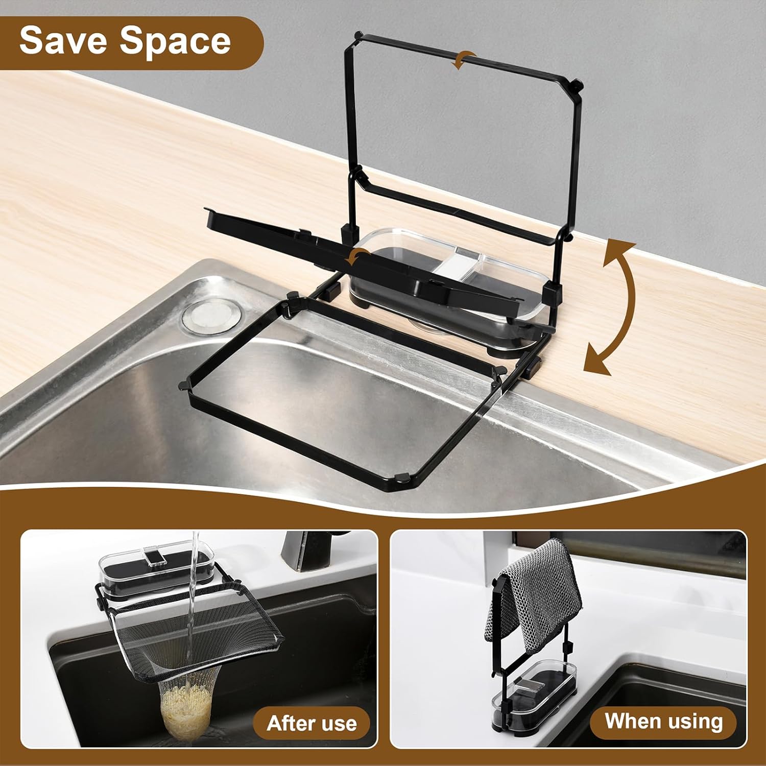 - 3.Space-Saving & Multi-Functional Design:Features a versatile design that rotates 90Β° to stand upright as a towel/dish rack or folds compactly when not in use. kitchen sink garbage strainer as a drain rack for fruits, veggies, and dishes.