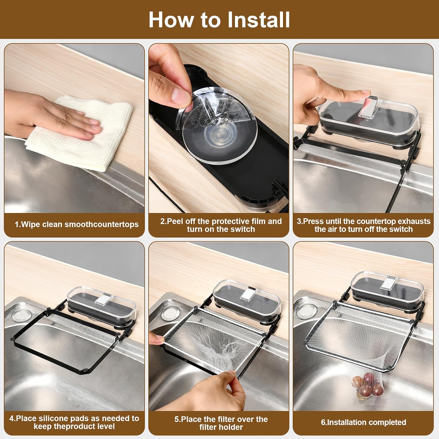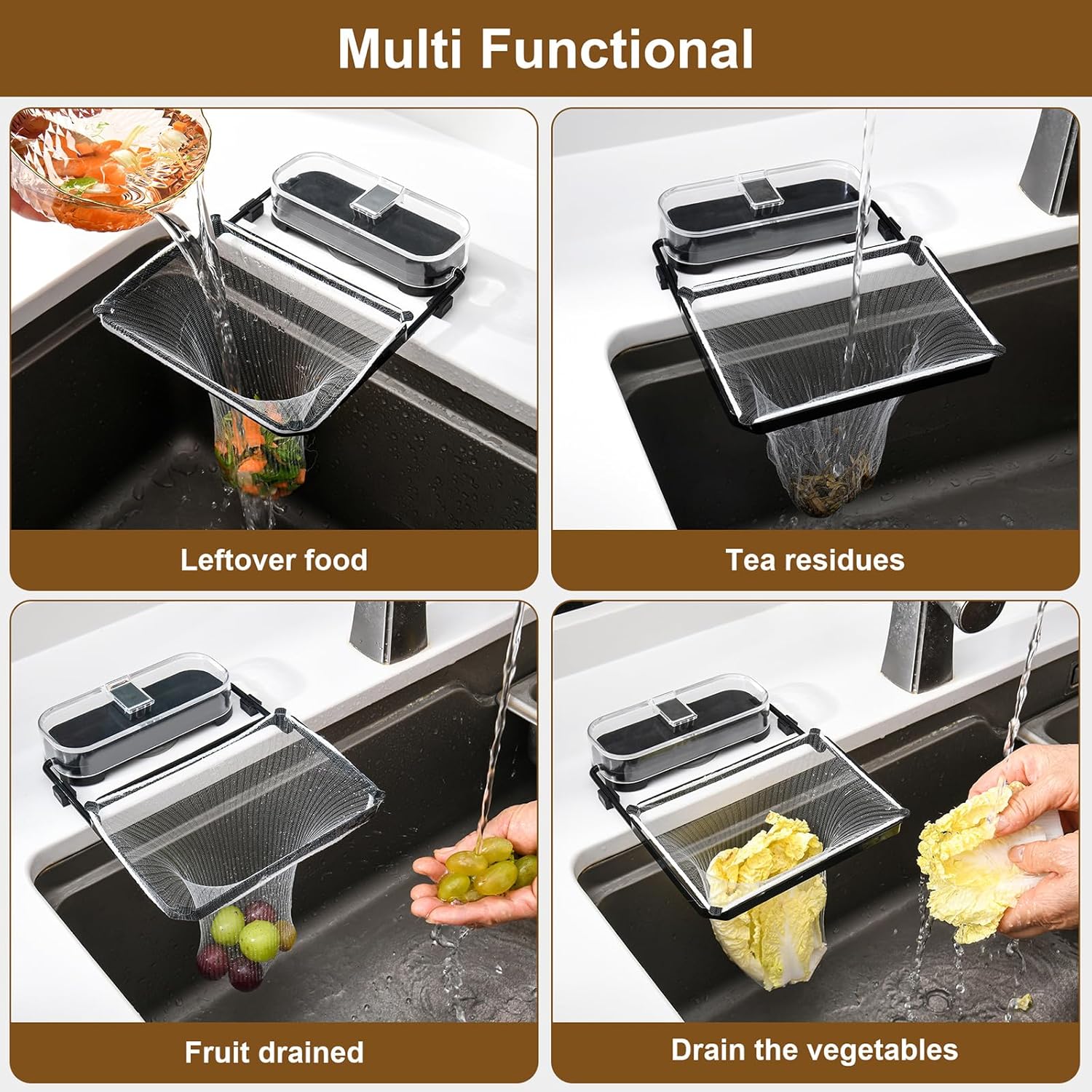 - 4.Includes 50 Kitchen Sink Food Strainer Mesh Bags + Easy Replacement: Comes with 50 high-quality polyester fiber mesh bags to effectively catch food scraps, peels, tea leaves, seasonings, and fabrics, preventing sink clogs. Effortlessly attaches to the frame corners for quick swaps.