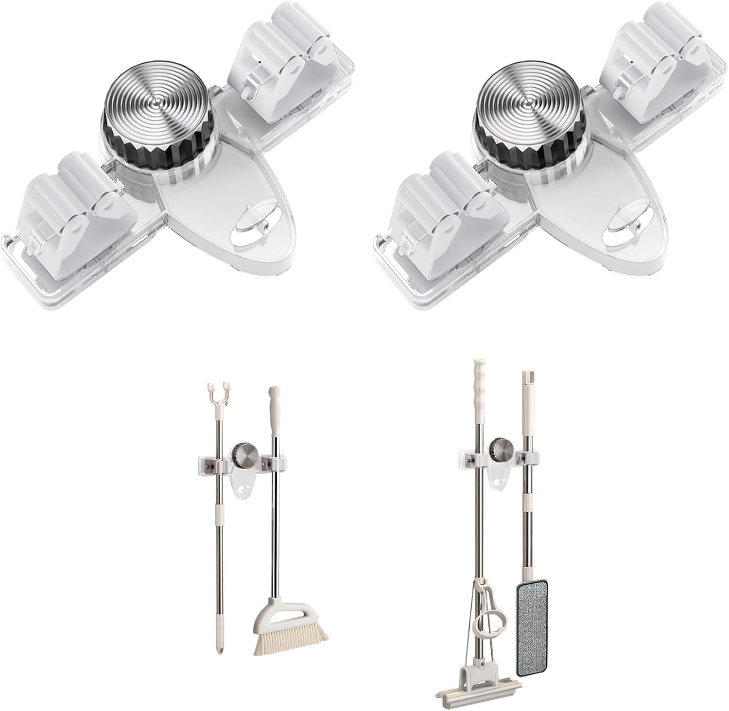 Mop and Broom Holder Wall Mount, No Punching Required Broom and Mop Organizer Wall Hanging with Hooks for Bathroom, Laundry Room, Garage, Kitchen,Garden Tool Organizer Storage (2pcs Transparent)