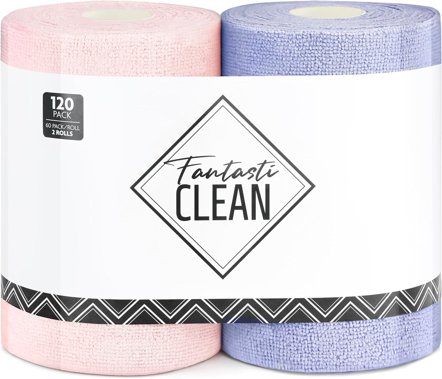 Fantasticlean Microfiber Cleaning Cloth Roll 2 Rolls 120 Pack, Tear Away Paperless Towels, 8" x 8", Reusable Washable Rags, Home Kitchen, Pet, Office, Indoor Outdoor, Portable (Pink and Light-Purple)