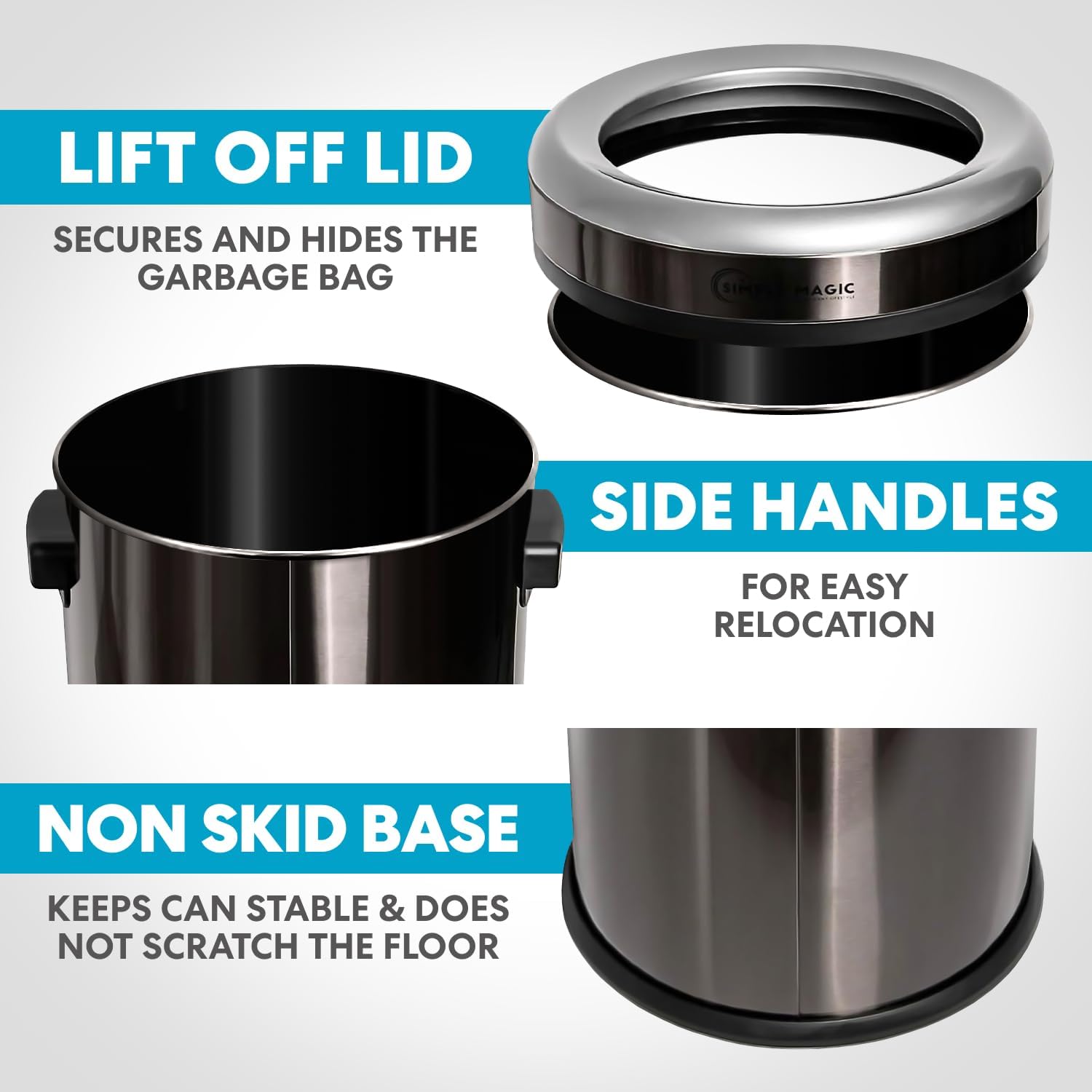 - QUICK & EASY DISPOSAL β Open Top design is perfect for Commercial Spaces and Busy homes: Restaurants, Restrooms, Offices, Lobbies, Stores β Quick & Easy Trash Disposal