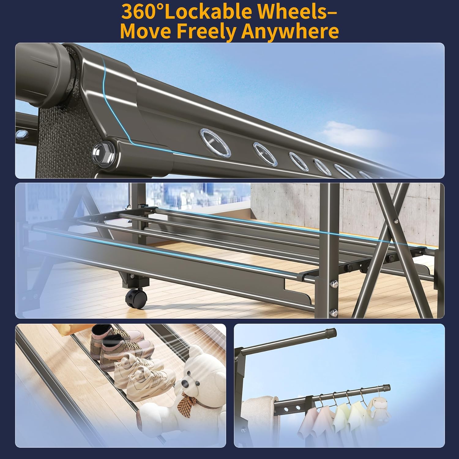 - 360°Lockable Wheels for Easy Mobility – Equipped with smooth-rolling, lockable swivel wheels that move freely in any direction. Allows effortless repositioning of the rack across different floor types, while the lock function keeps it securely in place when stationary.